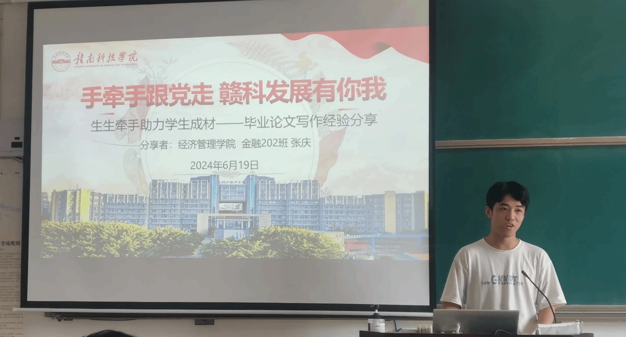 本网讯:6月19日上午,公司金融学专业在主教228教室开展主题为“手牵手跟党走,赣科发展有你我——生生牵手助力员工成材”的毕业论文写作经验分享活动。活动邀请金融专业优秀毕业论文候选人张庆同学为2021级金融员工分享毕业论文写作经验与心得,活动由金融教研室主任郑延智主持,胡佳老师参与。